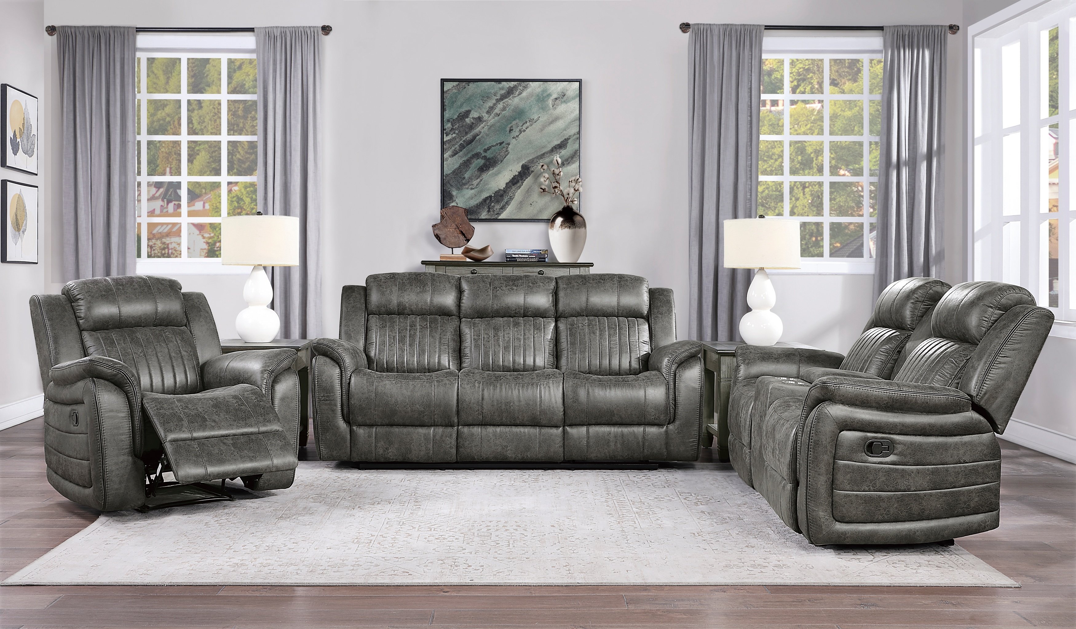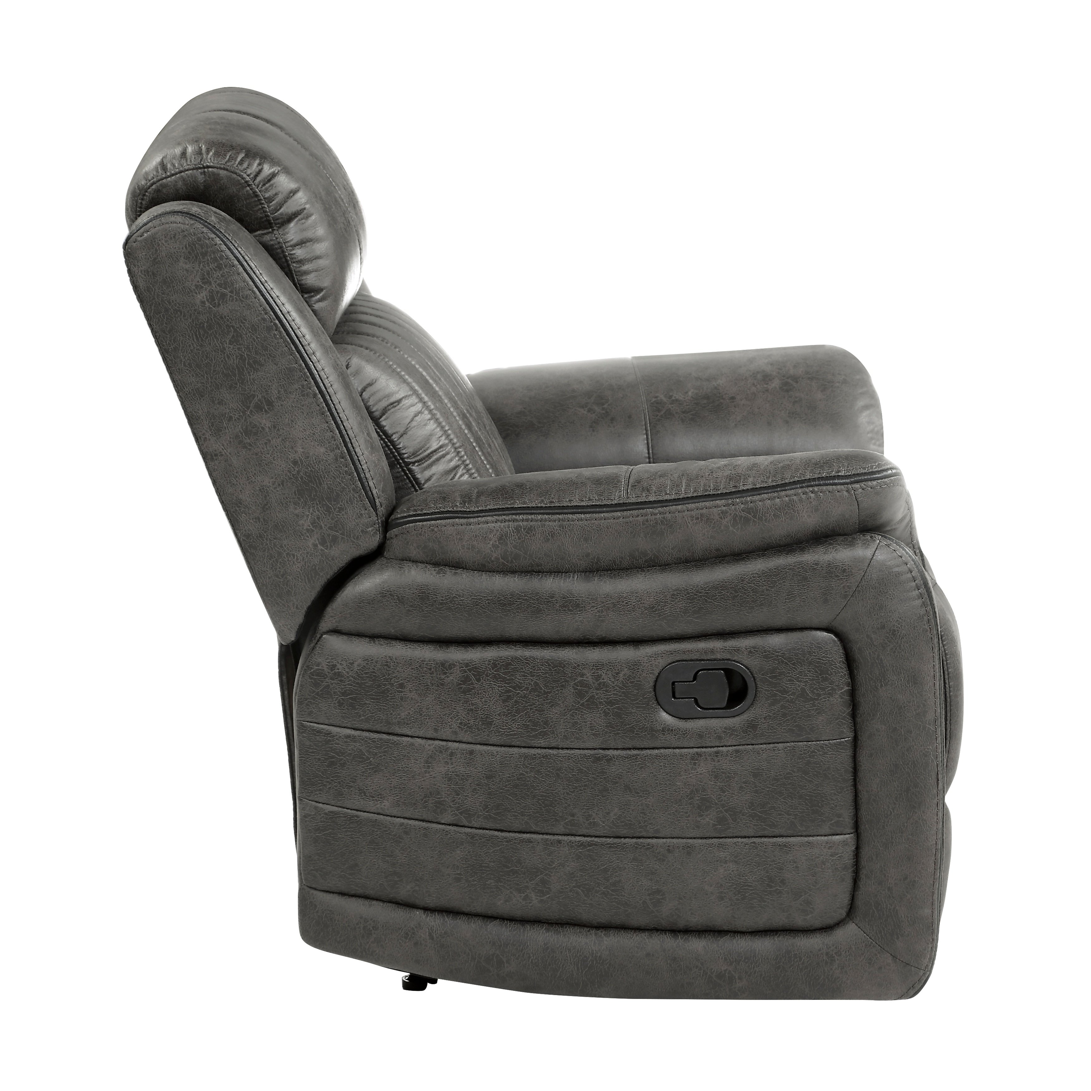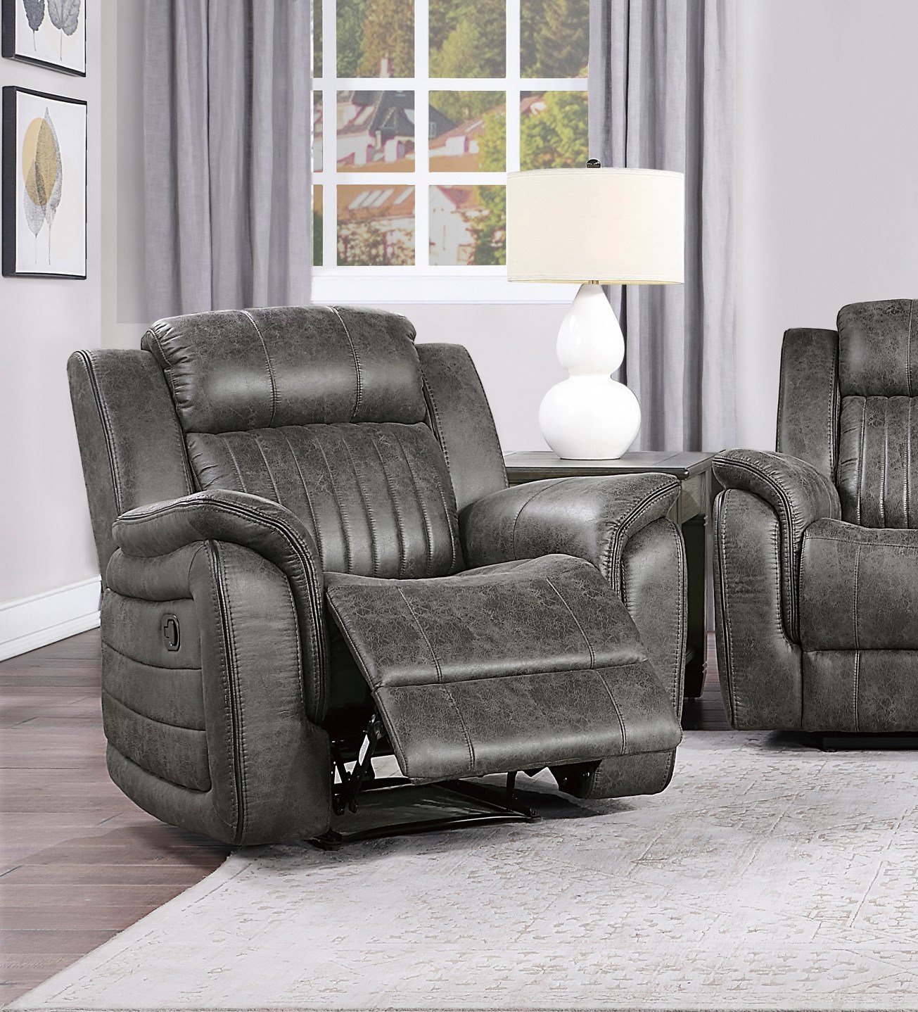 The design of the Centeroak Collection provides a platform for your relaxing downtime. From the classic transitional style to the versatile neutral color of the brown-ish gray polished microfiber fabric covering, this chair is the perfect addition to your living room. Plush seating features vertical tufting, pillow-top arms, enhanced by the reclining mechanism which is engaged with a pull of the side mounted tab, taking you from seated to prone in an easy motion.PRODUCT DIMENSIONS:Overall Dimension: 39.5" x 38" x 41"HSeat Width: 19.5"Seat Depth: 21"Seat Height: 20.5"Arm height: 26"Fully reclined length: 65.5"Fully reclined height: 32"Doorway width: 26"Listing Includes: One Reclining Chair Only.Sofa and Loveseat: Not included.Simple Assembly Require.