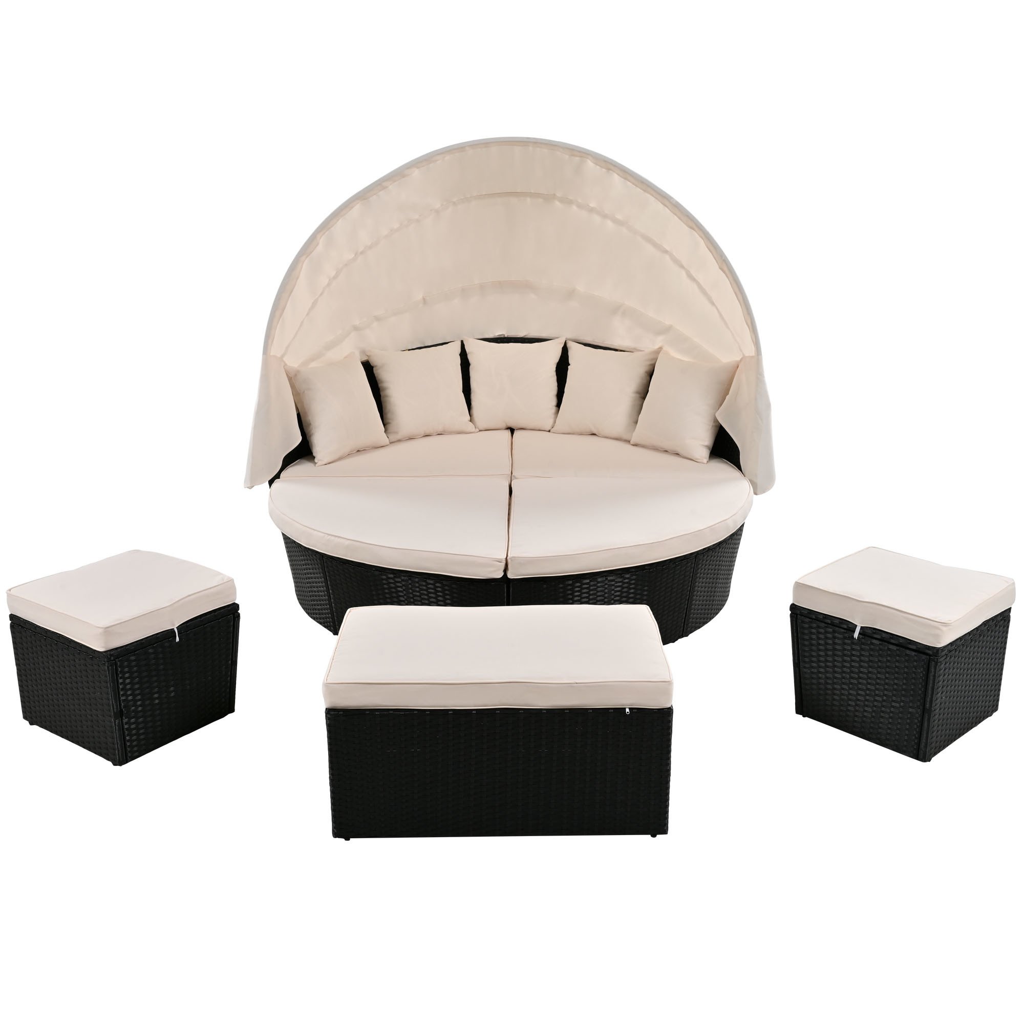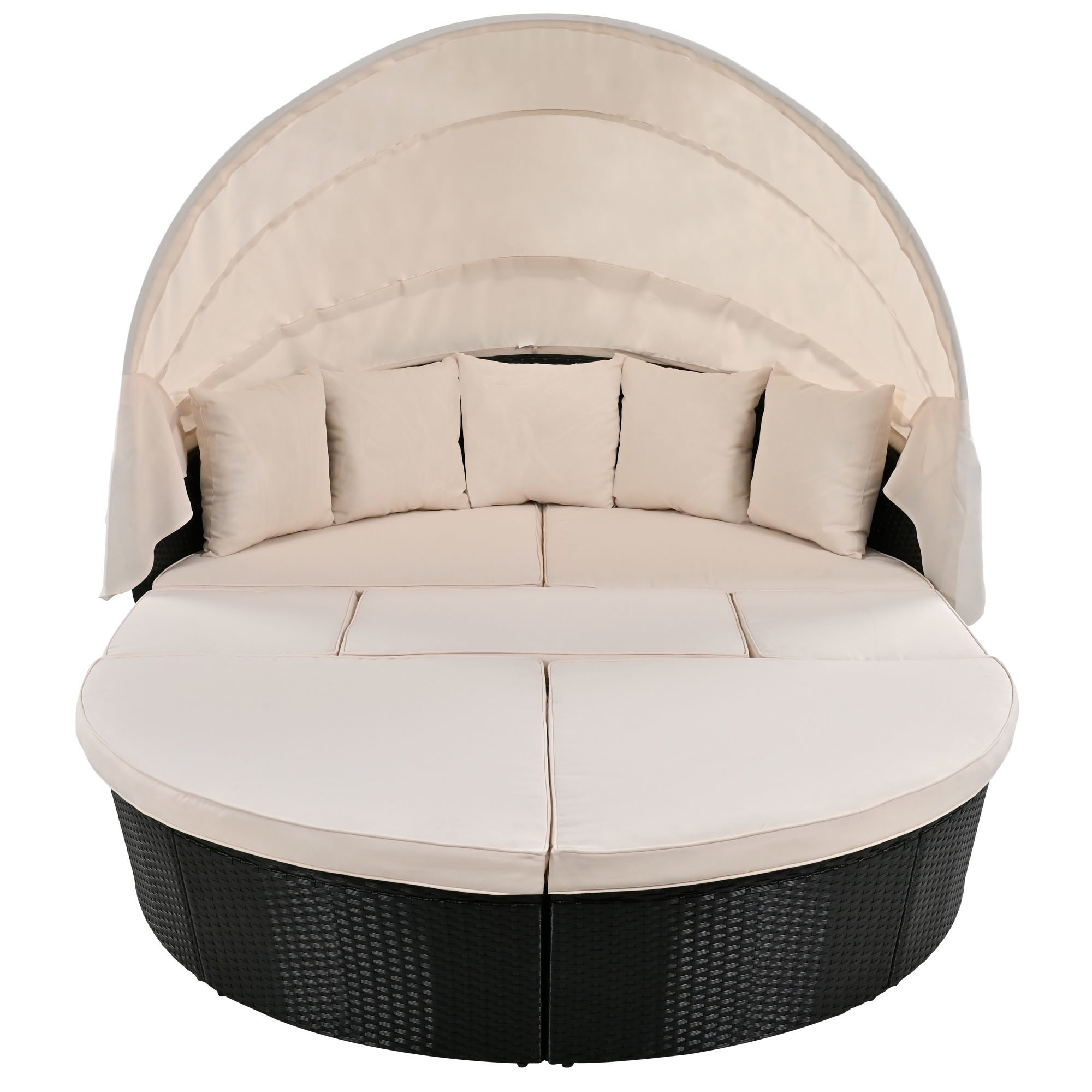 GO Outdoor rattan daybed sunbed with Retractable Canopy Wicker Furniture, Round Outdoor Sectional Sofa Set, black Wicker Furniture Clamshell Seating w