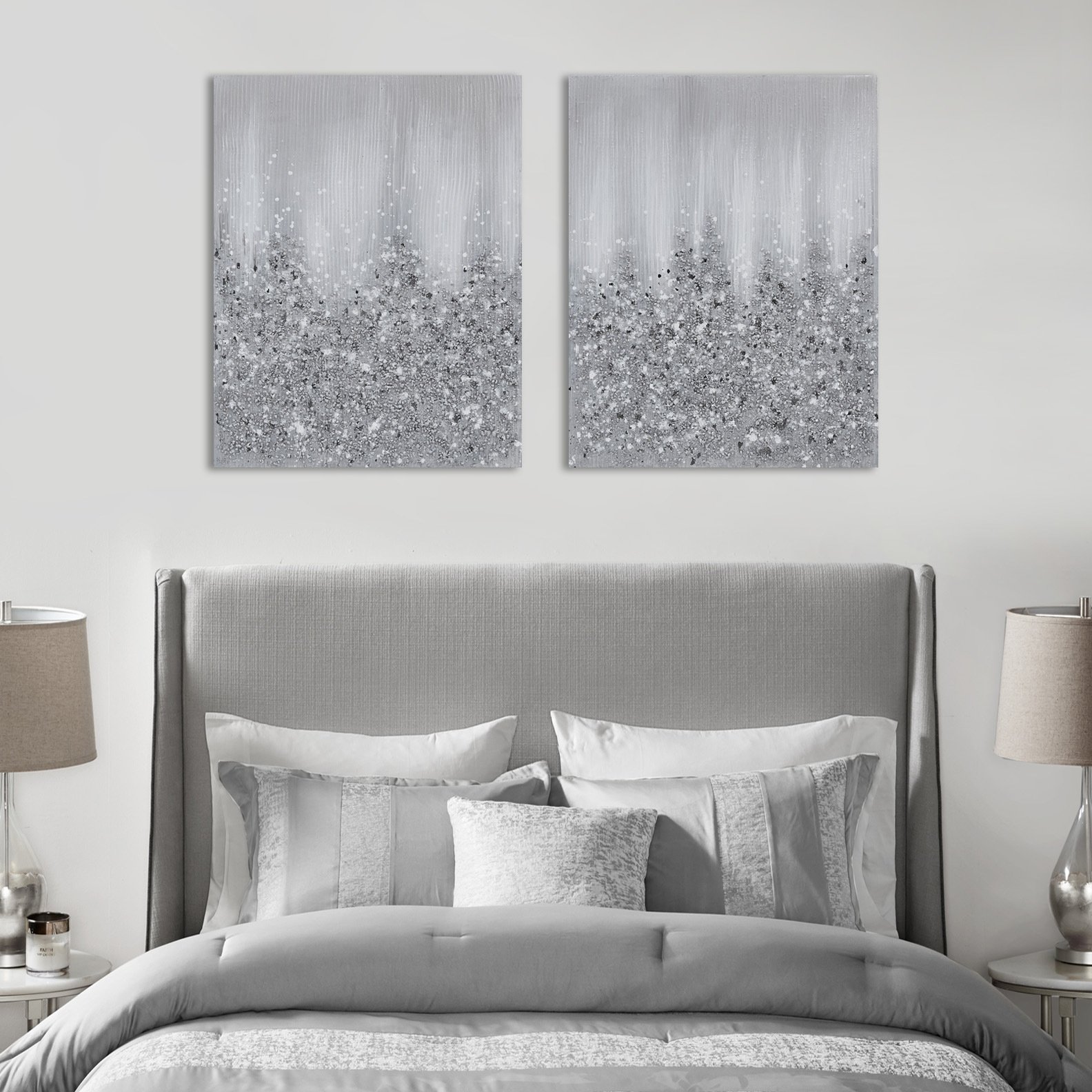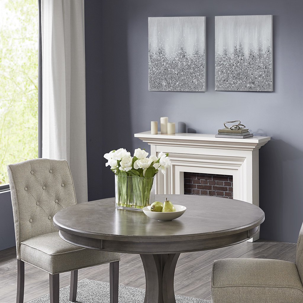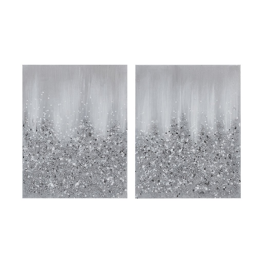 The Madison Park Glimmer Heavily Embellished 2-piece Canvas Wall Art Set brings a touch of glam to your home decor. This 2 piece canvas wall art set features a gradient abstract design in metallic hues for a striking modern look. 100% hand-brushed with real rock and stone embellishments add texture and dimension, while the silver glitter finish adds a beautiful sheen and luster. Each piece is finished with a cardboard backing for additional structure and 2 D-rings on the reverse making it easy to hang. Give your home a luxurious update by adding the perfect amount of sparkle, with our Madison Park Glimmer Art Piece Set. Due to hand embellishment of natural rock and stone; colors and glitz may vary slightly from image making each piece unique. Spot clean only; this set includes two pieces with each piece measuring 22x28".
