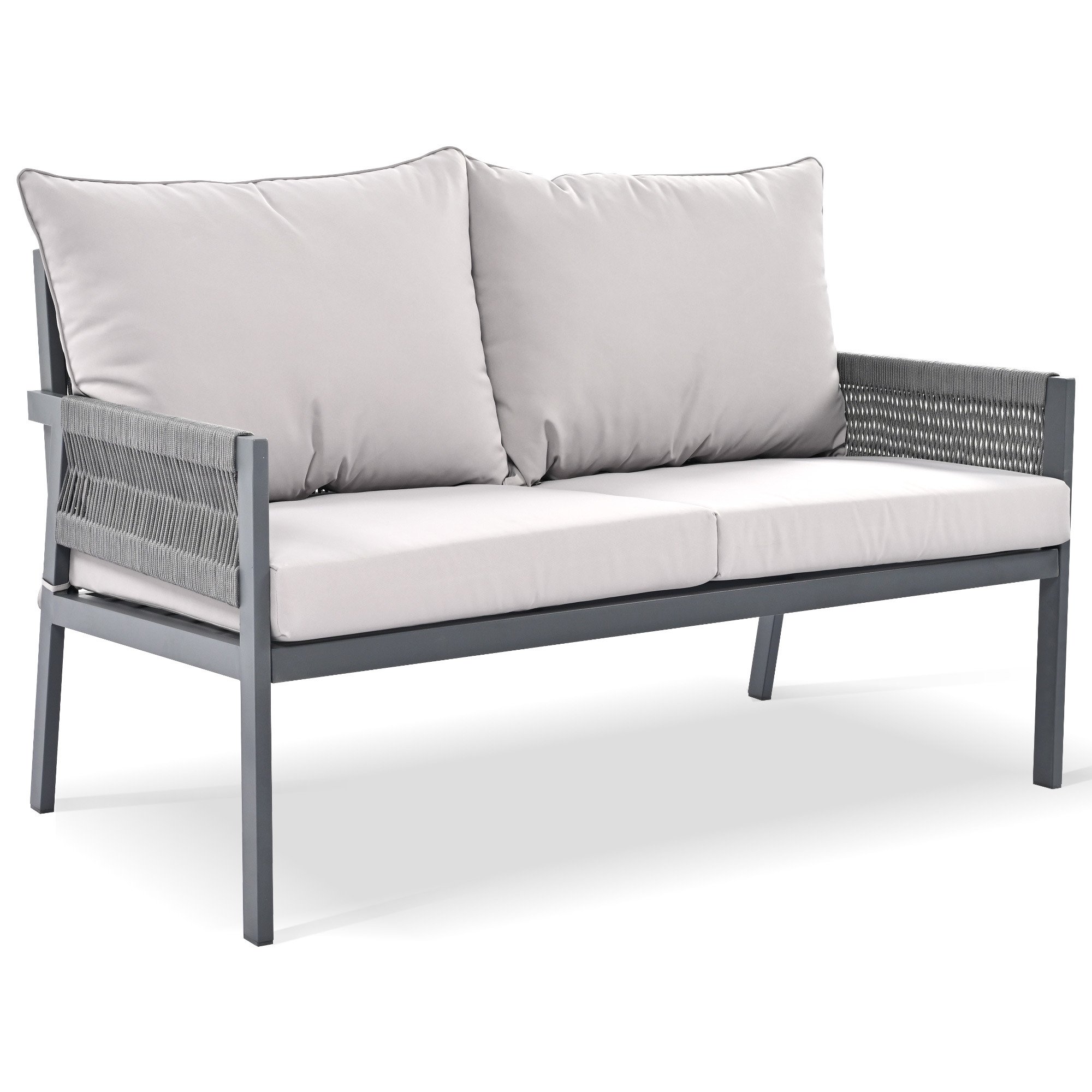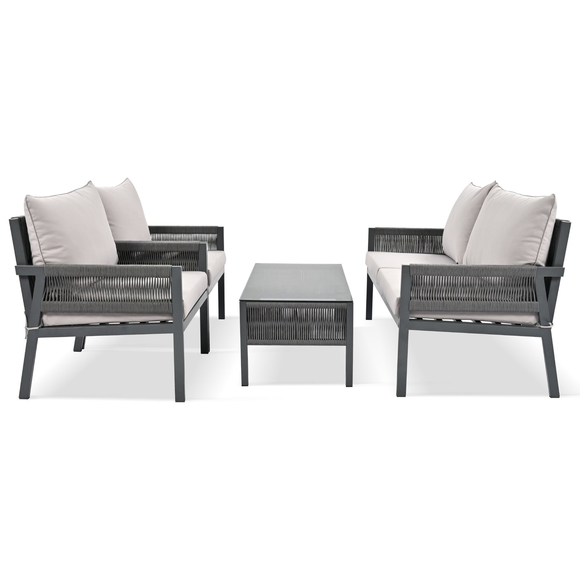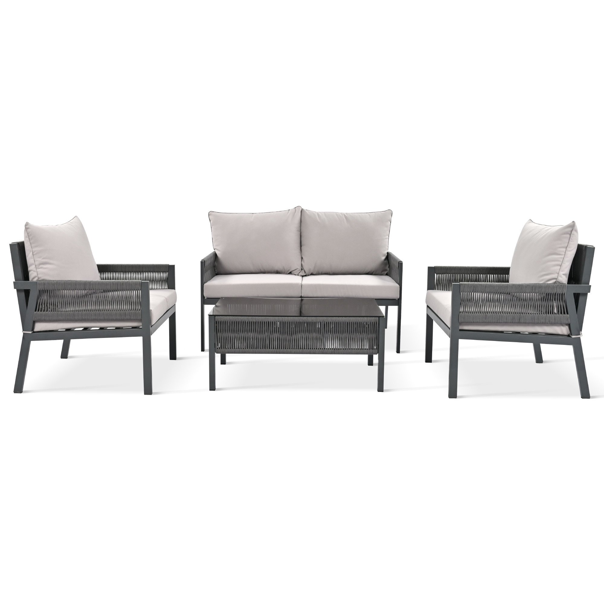 SummaryThis 4-piece set will give your outdoor space a fresh look that combines modern patio design with classic coastal farmhouse style. It includes one loveseat, two armchairs, and a rectangular Tempered Glass coffee table - all made from solid metal that's resistant to weather and water damage. The seating features open silhouettes with inviting arms and backs woven from rope for an added touch of natural charm. Plus, the machine-washable covers make clean-up after gatherings super easy!