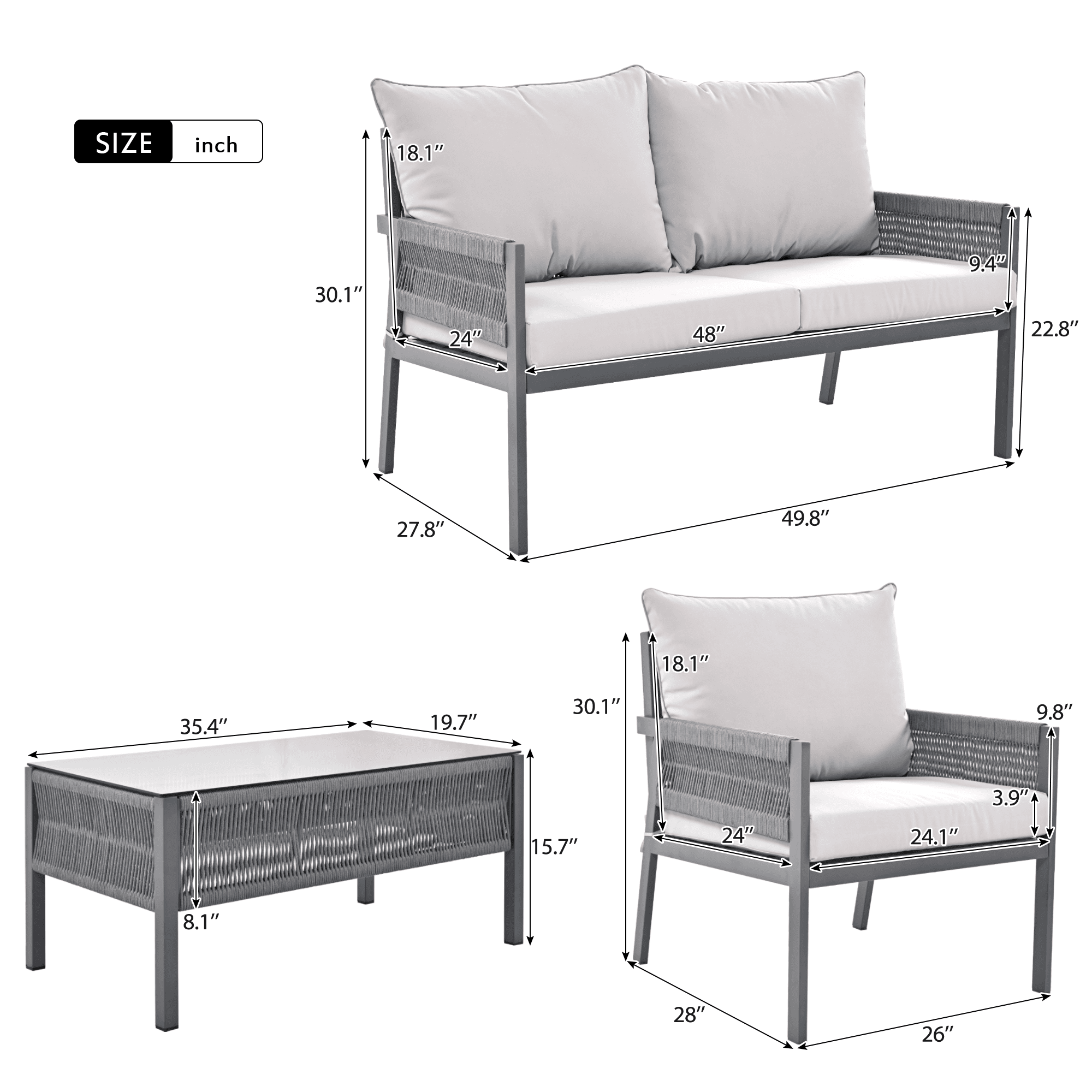 4-Piece Rope Patio Furniture Set, Outdoor Furniture with Tempered Glass Table, Patio Conversation Set Deep Seating with Thick Cushion for Backyard Por