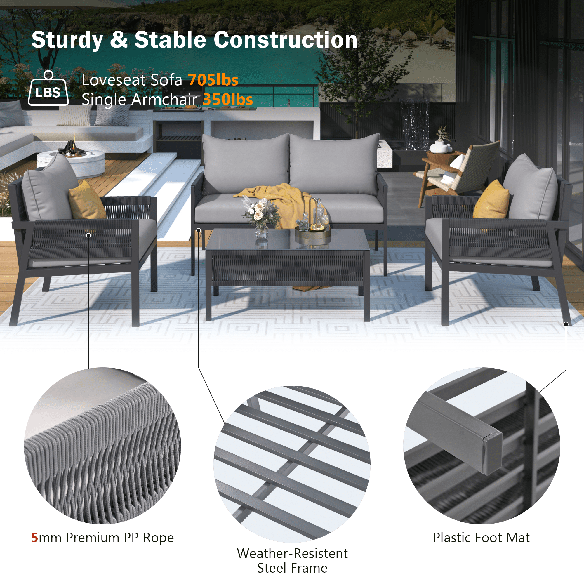Highlights[PP Rope][Metal Frame][3.9Inch Thick Seat & Back Cushion] [Tempered Glass Table][Modern Rope Weave Design] [Cushion Covers Water Repellent & UV protected & Fade-resistant and Abrasion-resistant] [Removable and Washable Cushion][Large Carrying Capacity] [Plastic Feet Pad]