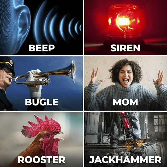 6 extremely loud wake up sounds – adjust the volume and tone of the six different unique sounds that will get you out of the bed and ready to start your day! Choose from rooster, bugle, nagging mom, jackhammer, siren, loud beep – up to 115db alarm volume