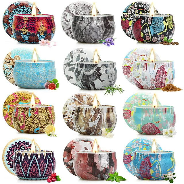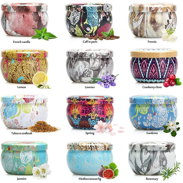 12 fragrance: scented candles gift set with 12 popular fragrance, including spring, lemon, gardenia, lavender, parisian cafe, figs, rosemary, freesia, french vanilla, jasmine, cranberry clove. Each candle gives off a peaceful and pleasant scent.