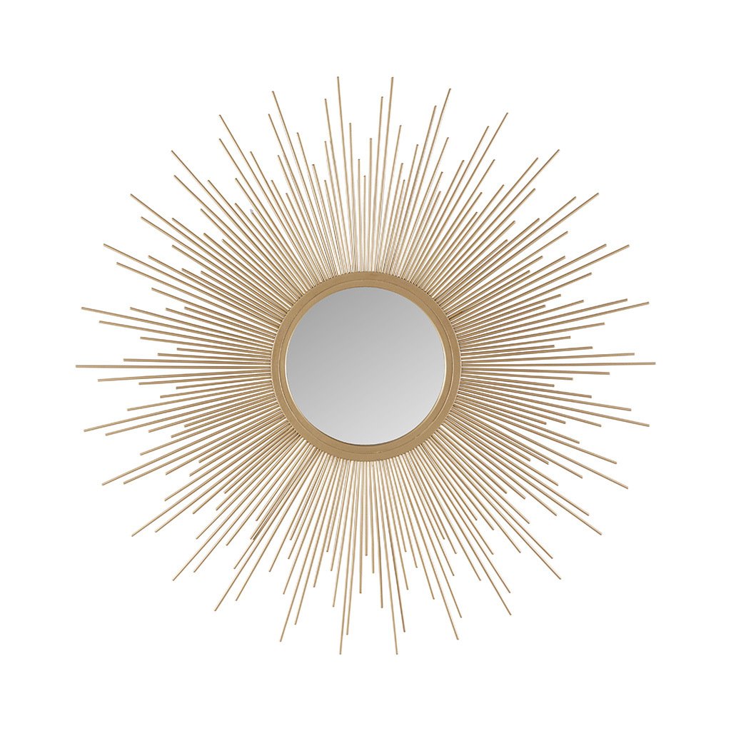 Add a modern and glamorous touch to your space with our Madison Park Sunburst Mirror. A stylized iron frame is featured in a sphere design creating beautiful dimension, while the gold foil adds a rich sheen and luster. The keyhole hanger feature on the reverse of the mirror allows for effortless hanging on your wall. Incorporate this wall mirror into your decor, for the perfect combination of chic luxe and metallic flair. Mirror is sold as a single piece and does not come as a set; for the complete look purchase other size for a stylized cluster or hang individually as a focus piece. The larger piece measures 29.5" with 8"D mirror size, while the smaller piece measures 14.5" with 3.875"D mirror size. Handle with care; Gently wipe clean with a damp cloth