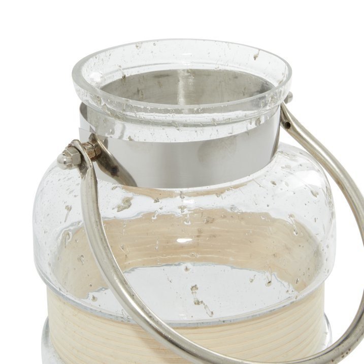 Silver metal and beige ribbon strips decorate the clear glass lantern