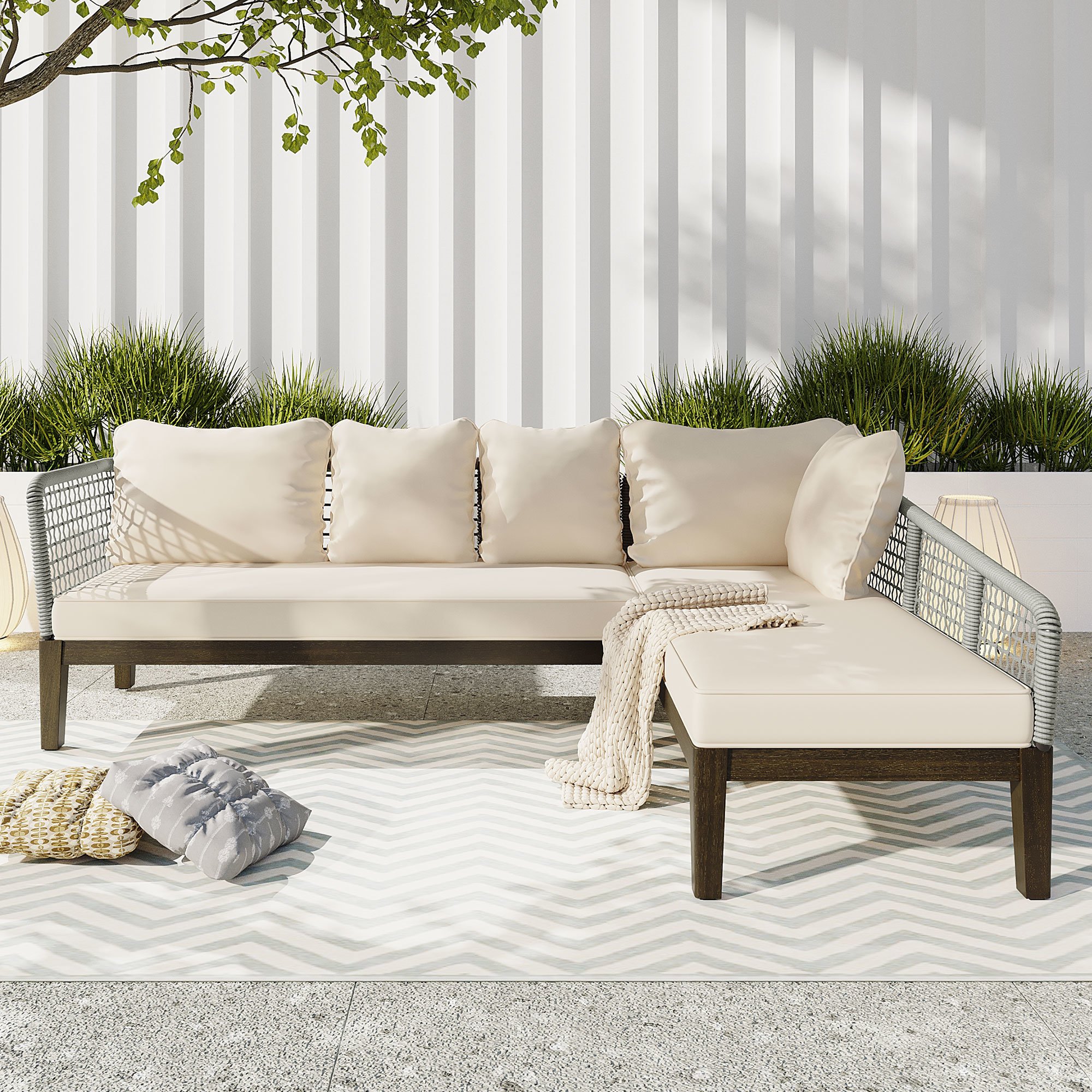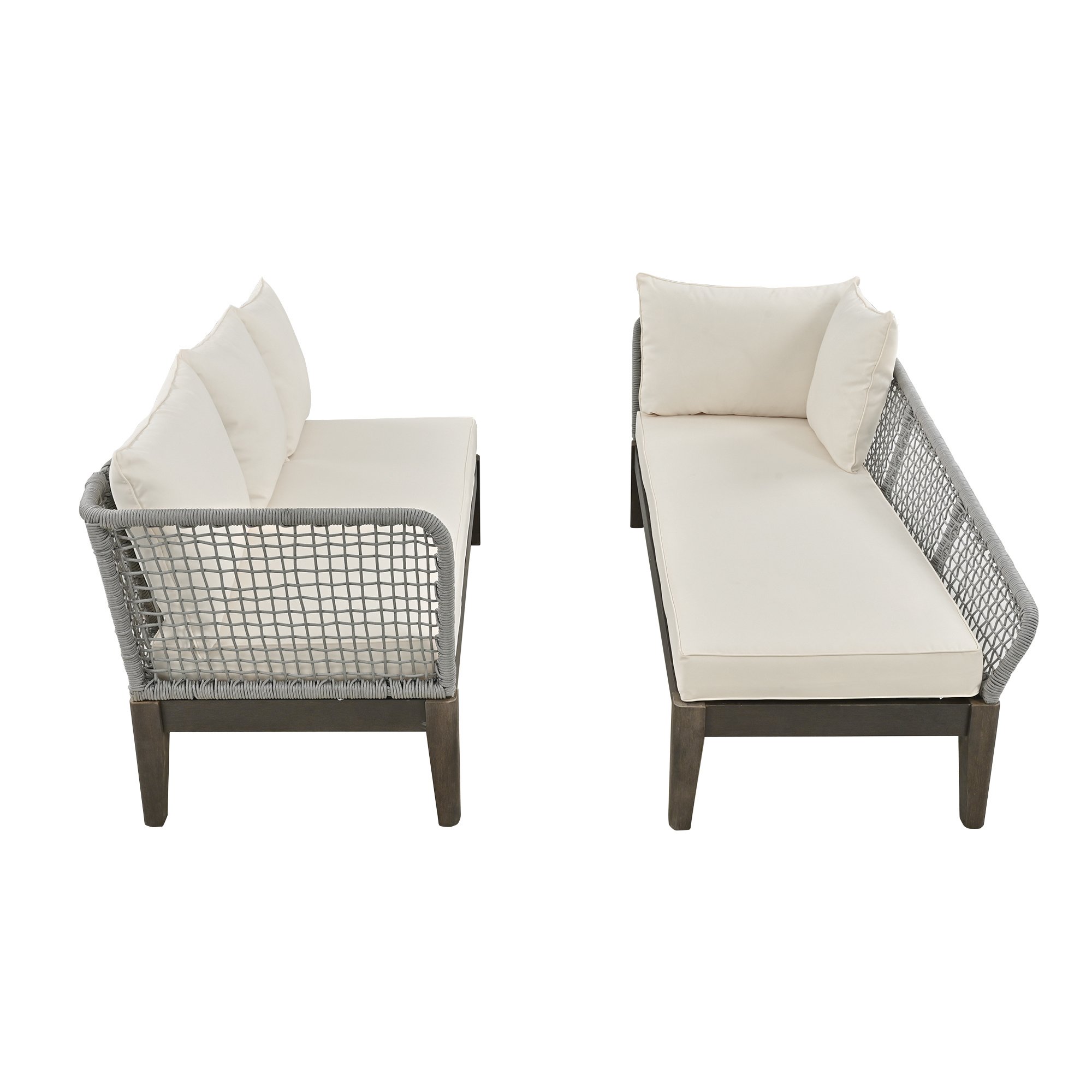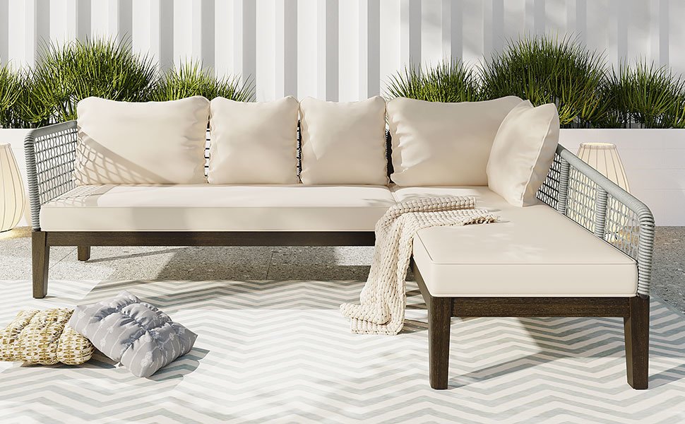 [Sleek Modern Design]Designed with a sleek, low profile, this 2-piece sectional sofa set for five people features a sturdy frame made of solid acacia wood, known for its natural moisture resistance. The fluffy, durable cushions are specially treated to resist water and UV damage. The back and armrests are elegantly wrapped in hand-woven regatta rope, showcasing a distinctive crosshatch pattern that creates an elegant, modern and inviting outdoor seating area.