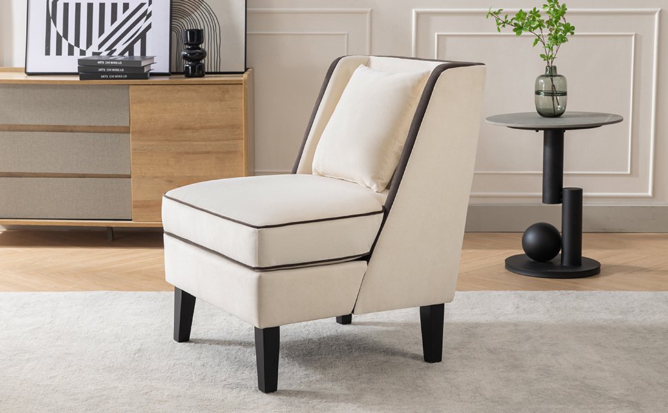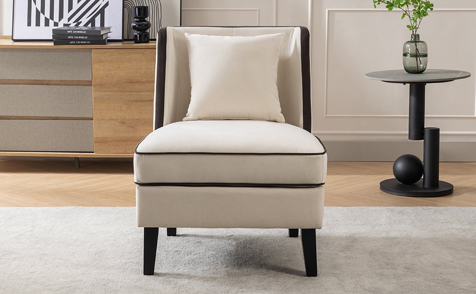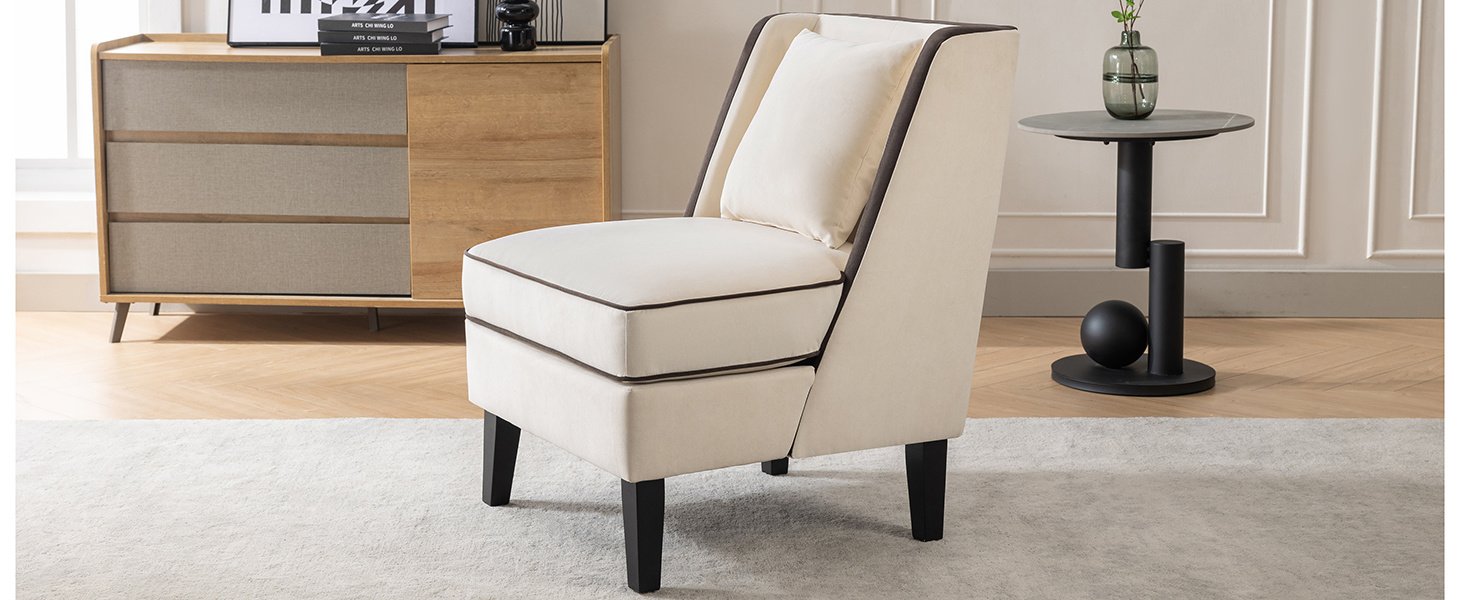 Velvet Upholstered Accent Chair with Black Piping, Cream and Black